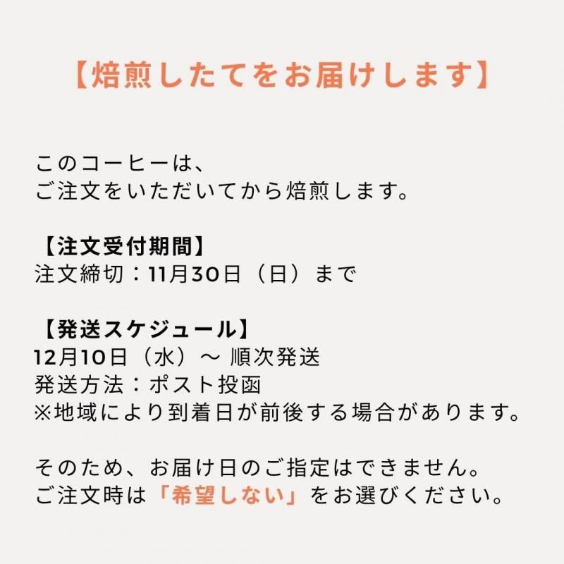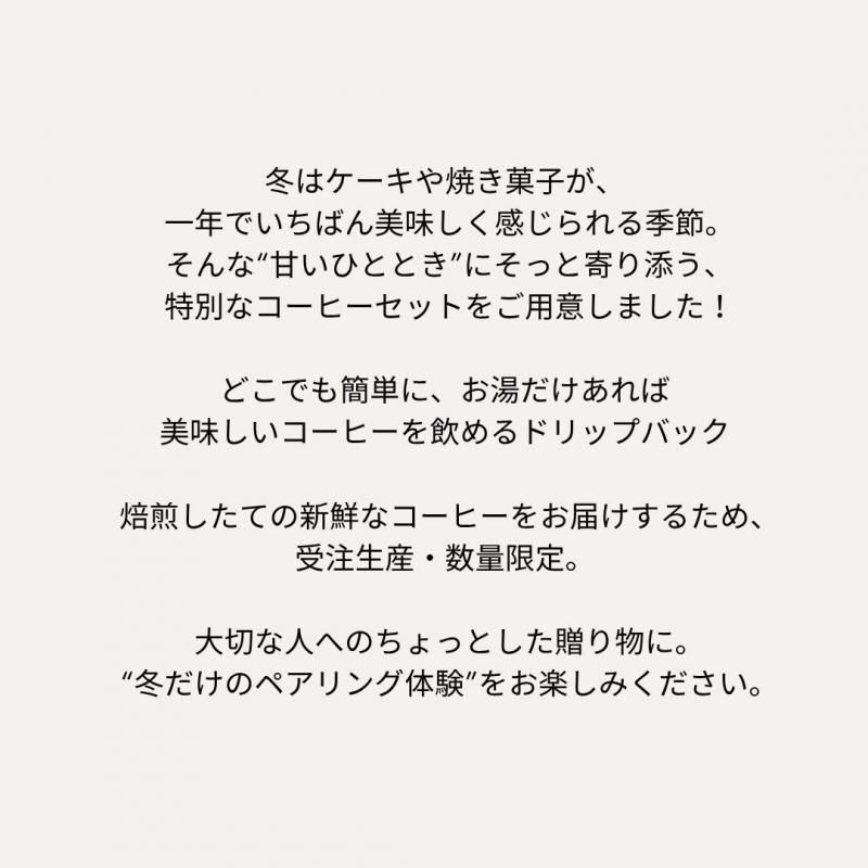 冬はケーキや焼き菓子が恋しくなる季節。 そんな“甘いひととき”にぴったり寄り添う、 冬限定のスペシャルドリップバッグセット をご用意しました。 今回は、二子珈琲自慢のスペシャリティコーヒー豆を ドリップバッグで手軽に楽しめる特別仕様。 ☕️ 【セット内容|10パック】 ■ 商品内容 ・タンザニア(キリマンジャロ)中深煎り 5パック 果実感×ミルキー。冬のケーキタイムが上品に変わるコーヒー ・グアテマラ 中深煎り 5パック バターの香りと重なり合う、焼き菓子のための一杯。 どちらも“冬に食べたくなるスイーツ”と相性抜群です! 【受注生産・数量限定】 より新鮮な状態でお届けするため、 受注締切後に焙煎 → 熟成 → パック詰め を行います。 注文締切:11/30(日) 発送予定:12/10(水)〜 順次発送 ※ポスト投函でお届けします。 ※購入する際、お届け日は「指定なし」を選択ください。 🍰 【こんな方におすすめ】 ・冬のスイーツとコーヒーの相性を楽しみたい方 ・仕事や家事の合間に、手軽においしい一杯を楽しみたい方 ・ショートケーキや焼き菓子が大好きで、相性の良いコーヒーを探している方 ・年末のご褒美時間や、ちょっとした手土産・ギフトに選びたい方 ・新鮮なスペシャルティコーヒーを、ドリップバッグで手軽に味わいたい方 冬のひとくちを、もっと特別に。 おやつ時間にも、夜のリラックスタイムにも。 甘いスイーツと重なる香りを、手軽なドリップバッグでお楽しみください。 数量限定のため、なくなり次第終了です。